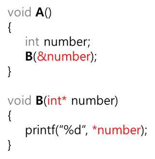 A에서 선언된 number의 주소값을 B의 포인터 매개변수에 넣어줌으로써,