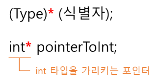 포인터의 선언은 포인터가 가리킬 대상의 타입과 * 을 사용하여 선언할 수 있다.
