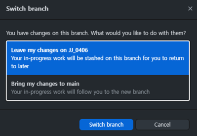 작업중인 Branch에 변경사항이 있어 Commit이 이루어져야 하는 상황에 Branch를 이동할 경우, Branch에 변경사항이 있다는 경고문이 발생한다.