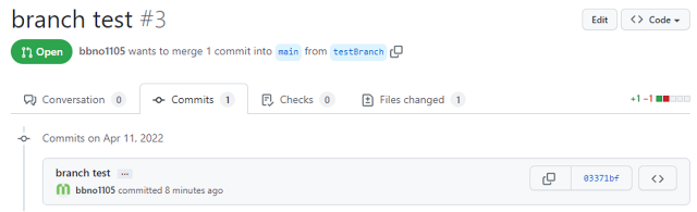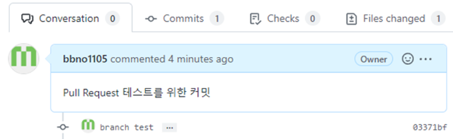 Pull Request의 Commit 내용이 "Merge pull request #n from bbno1105/JJ_0406"과 같이 branch 주소와 함께 입력된다.
