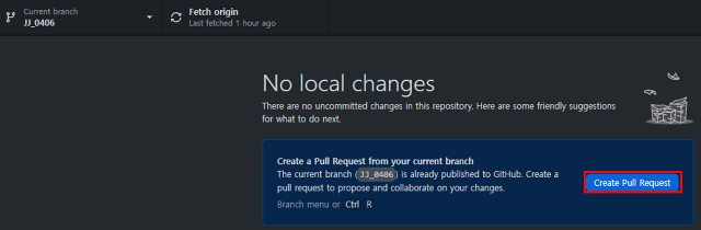 Branch가 main(또는 master)가 아닌 경우 main으로 Pull Request하는 버튼이 활성화 된다.