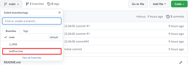 상단 Current branch를 통해 원하는 branch를 클릭하여 이동할 수 있다.