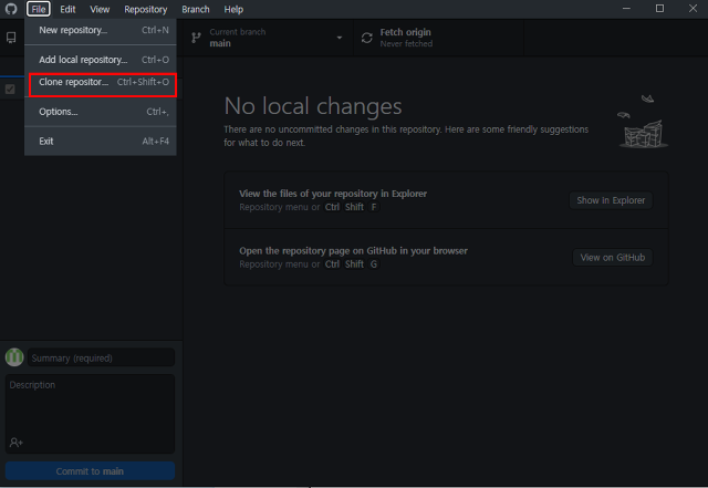 상단 메뉴의 File > Clone repository (Ctrl + Shift + O)를 눌러 앞에 생성한 git 프로젝트를 불러올 준비를 한다.