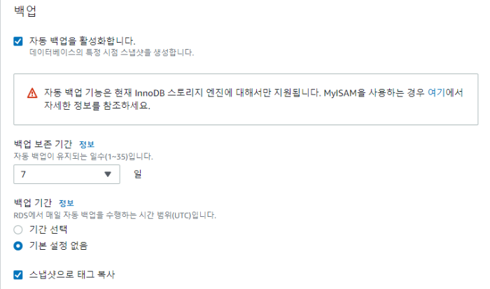AWS RDS에서 자동으로 백업하는 보존 기간을 설정할 수 있다.
