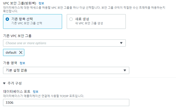 VPC 보안 그룹 설정 및 포트 설정도 기본값으로 진행했다.