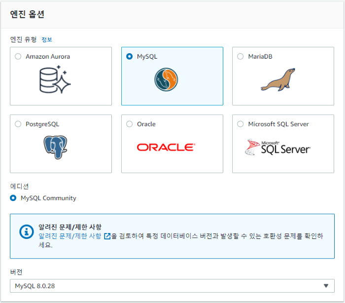 MySQL, MariaDB, Oracle 등 원하는 엔진과 버전을 선택한다.