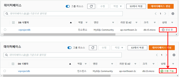 데이터베이스의 생성은 n분 정도 소요되며 생성 완료 시 사용 가능 상태로 변경된다.