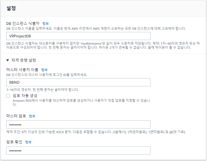 DB 인스턴스 식별자와 자격 증명 정보(이름/암호)를 입력한다.