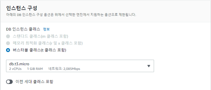 DB 인스턴스 클래스에서 데이터베이스 서버 컴퓨터의 사양을 설정할 수 있다.