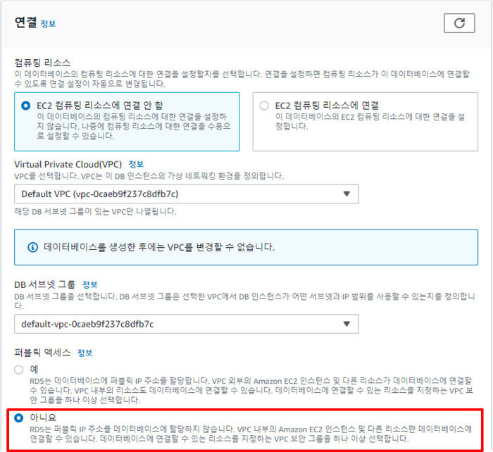 퍼블릭 엑세스 값을 기본 설정인 아니요로 설정하여 안전한 네트워크 환경을 설정한다.