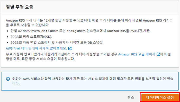 월별 추정 요금을 확인하고 데이터베이스 생성을 진행한다.