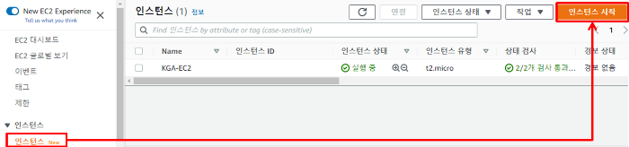 EC2 인스턴스 페이지에서 인스턴스 시작 버튼을 눌러 인스턴스를 생성한다.
