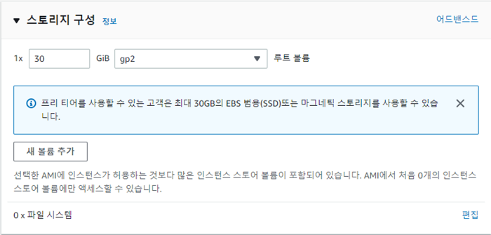 프리 티어로 설정하였기에 기본으로 설정된 30GB의 범용 SSD(gp2)로 진행하였다.