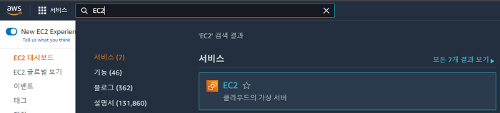 AWS 서비스에 EC2를 검색하여 EC2에 접근한다.