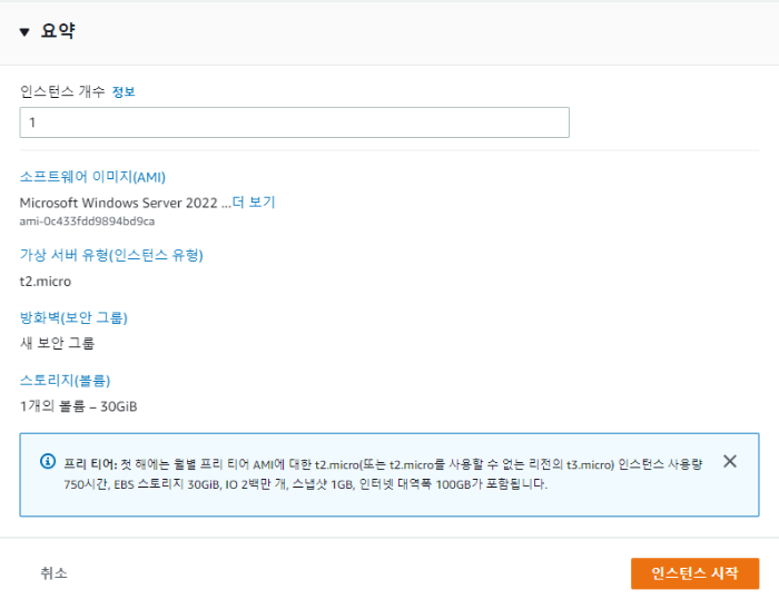 설정한 세팅의 요약 정보를 확인하고 인스턴스 시작 버튼을 누르면 인스턴스 생성이 시작된다.