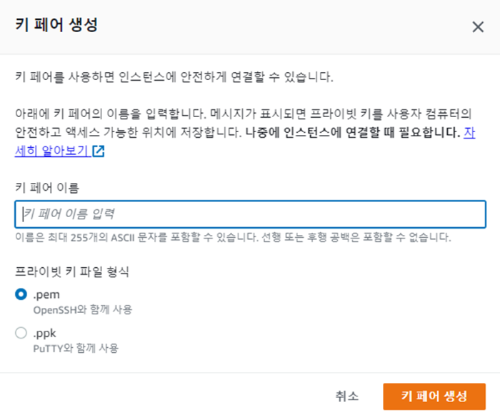 키 페어의 이름을 입력하고 키 페어를 생성하면 .pem 또는 .ppk 확장자의 키 페어 파일이 다운로드 된다.
